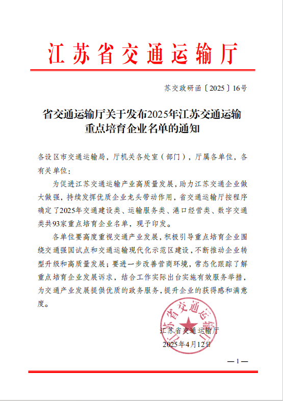喜报!智慧港口公司入选2025年江苏交通运输重点培育企业