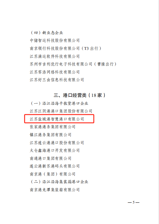 近日,江苏省交通运输厅公布了“2025年江苏交通运输重点培育企业”名单,盐城港智慧港口公司入选,上榜港口经营类沿江沿海干散货港口企业。