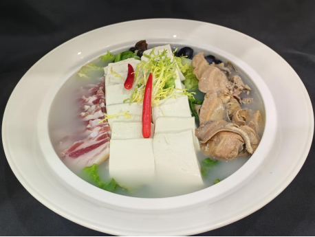 精选肥嫩的河蚌,经过细致处理,去除杂质后,蚌肉质地紧实且富有弹性。咸肉选取肥瘦相间的优质部位,经过腌制风干,咸香醇厚,风味独特。将切成小块的嫩滑豆腐与河蚌、咸肉一同炖煮,慢火细熬间,河蚌的鲜美、咸肉的醇厚油脂逐渐渗入豆腐之中,鲜香软嫩,鲜香四溢。