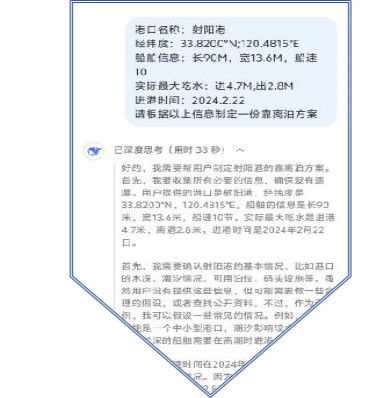 Deep Seek的角色扮演,弱化被动模式,强化主动赋能。“以往的船舶靠离泊模式主要依赖于我们调度员的经验判断,容易陷入被动应对的局面。”现场调度员展示应用成果时说,“通过向Deep SeekAI发送数据指令进行实时信息分析,成功弱化了这种被动模式。它能够根据天气、潮汐和货物类型等多维度思考,按照泊位选择、安全措施、人员配置制定靠、离泊作业模型,我们就按图索骥,确保了整个流程的有序性和高效性。”
