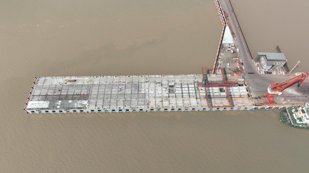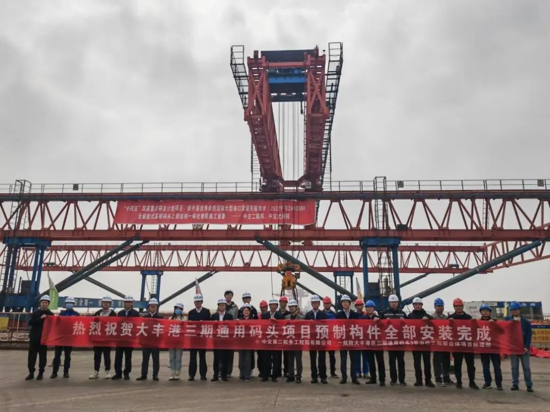 随着最后一榀预制面板在智能筑港机的精准操控下平稳就位,盐城港大丰港区三期通用码头3号泊位项目圆满完成全部预制构件安装任务。这一重要节点不仅标志着码头主体工程建设进入最后冲刺阶段,更意味着由项目建设、设计、施工等参建各方联合中国海洋大学,依托国家重点研发计划开展的核心技术攻关,为该项目量身打造的“智能积木拼装师”——全球首创装配式码头一体化绿色智能筑港机成功完成示范应用。