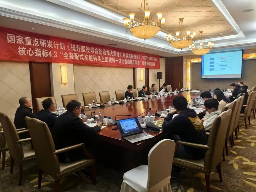 本工程位处大丰港区开敞海域,常年风浪大,最大潮差达到6米,涨落潮流急,传统浮式起重船无法完成上部结构施工。为解决恶劣海况下码头上部结构快速安装问题,为项目量身打造的智能筑港机,该设备配备了数字监控平台,在安装下放过程中,系统自动识别梁板安装目标位置图像后,将构件快速、平稳、精准落入,实现全过程智能安装。全装配式高桩码头上部结构一体化智能施工装备是国家重点研发计划项目的核心指标,趁此阶段项目组组织召开了现场见证考核会,邀请来自盐城市交通运输局、盐城市港航事业发展中心、盐城市交通规划设计院等单位的专家到现场进行见证考核,经过现场考察、会议审查及资料查阅,一致认为达到了考核指标要求,至此该装备研发在此项目上的科技创新示范应用得到了有力的成功验证。