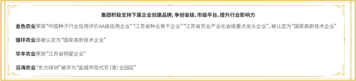 公司除开展日常经营业务外,还高度重视农业科技运用,孵化培育有国家高新技术企业2家,设有1个博士后工作站、3个研究生工作站,建有农业部可再生能源清洁化利用实验基地、江苏省优质稻麦工程技术研究中心、盐城市工程技术研究中心、盐城市市级企业技术中心、盐城市农机化科技示范基地,已通过国家、省级审定品种20个,申报各类专利84项,不断探索和应用现代农业科技,为传统农业赋能增效。
