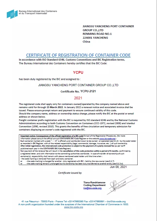 6月10日,从国际集装箱局(法国)传来喜讯,盐城港集团自备的200只集装箱,全部完成前缀YCPU的注册登记手续(证书编号:YCPU-2121),正式成为可以全球流通的集装箱。自此,盐城港自备箱在世界上有了自己的名字—“YCPU”,拿到了自己的“环球通行证”。
