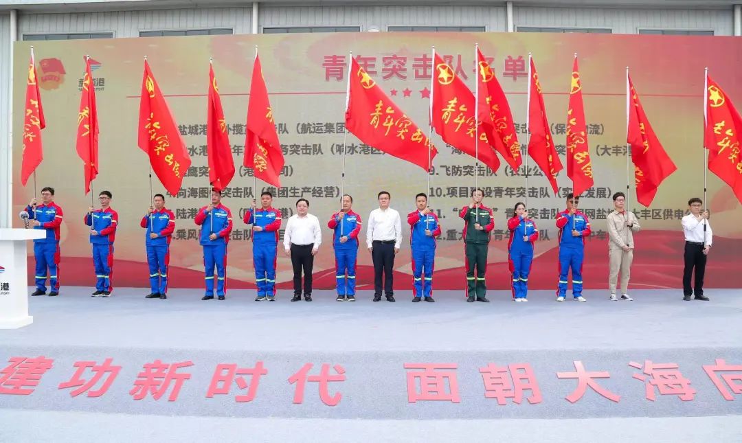 活动中,与会领导为12个围绕服务重大项目而组成的青年集体突击队进行授旗,青年突击队、青年文明号代表作表态发言,并举行了“强国复兴有我 青春燃在海港”盐城港青年宣誓仪式。
