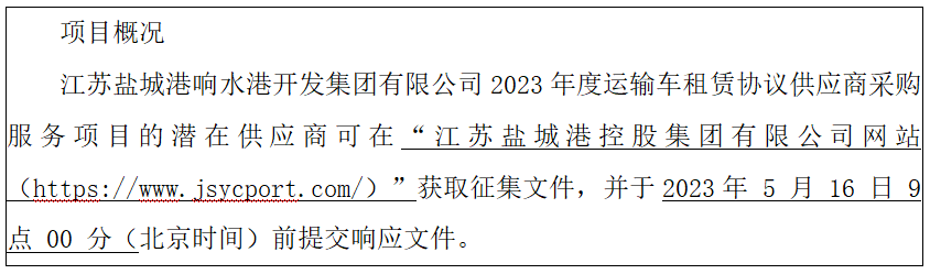 江苏盐城港响水港开发集团有限公司现就江苏盐城港响水港开发集团有限公司2023年度运输车租赁协议供应商采购服务项目征集供应商,欢迎符合条件的供应商参加本次框架协议采购活动。
