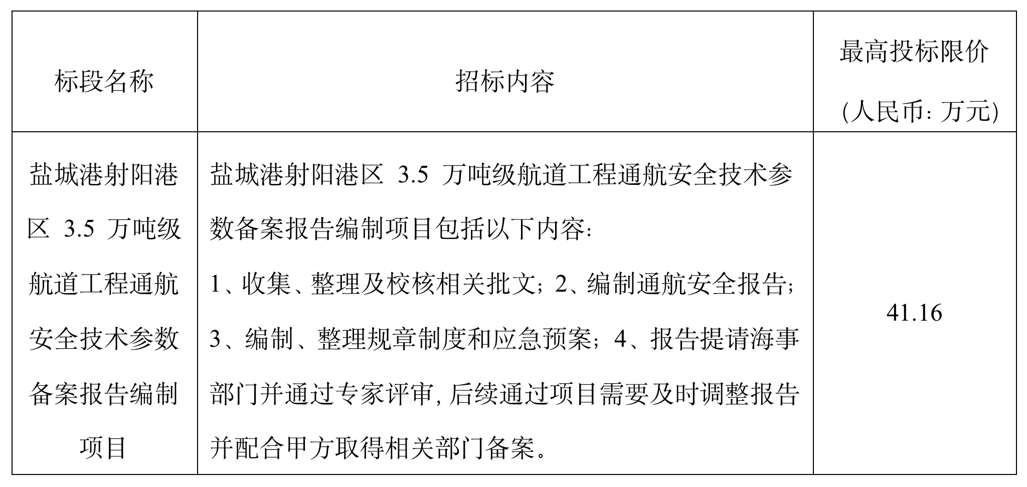 一、江苏盐城港射阳港开发集团有限公司负责实施的盐城港射阳港区 3.5 万吨级航道工程通航安全技术参数备案报告编制项目,已经相关部门批准建设。现决定对该项目进行公开招标,现邀请潜在投标人参加本项目投标。