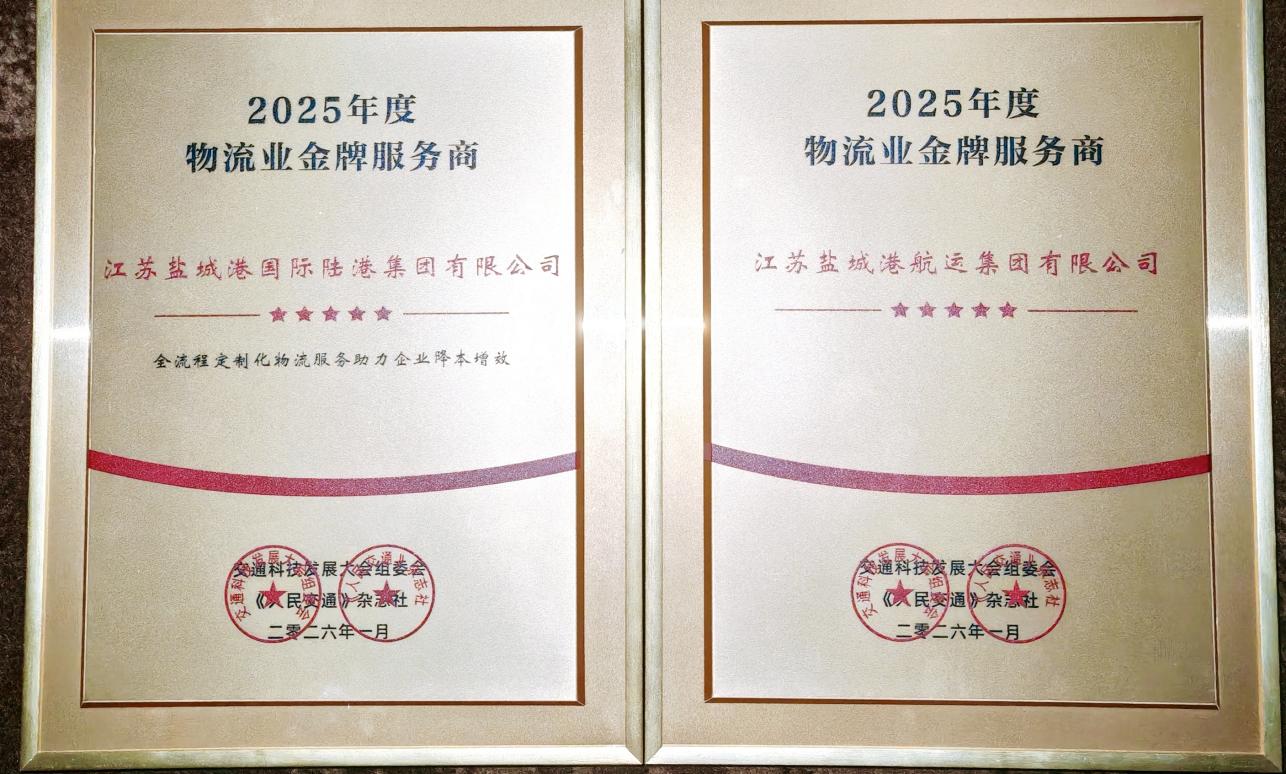 近日,在青岛举办的第六届中国交通科技发展大会上,盐城港陆港集团、航运集团凭借各自的“全流程定制化物流服务”创新模式和“绿色智慧赋能多式联运高质量发展”特色实践,双双荣获“2025年度全国物流业金牌服务商”称号。