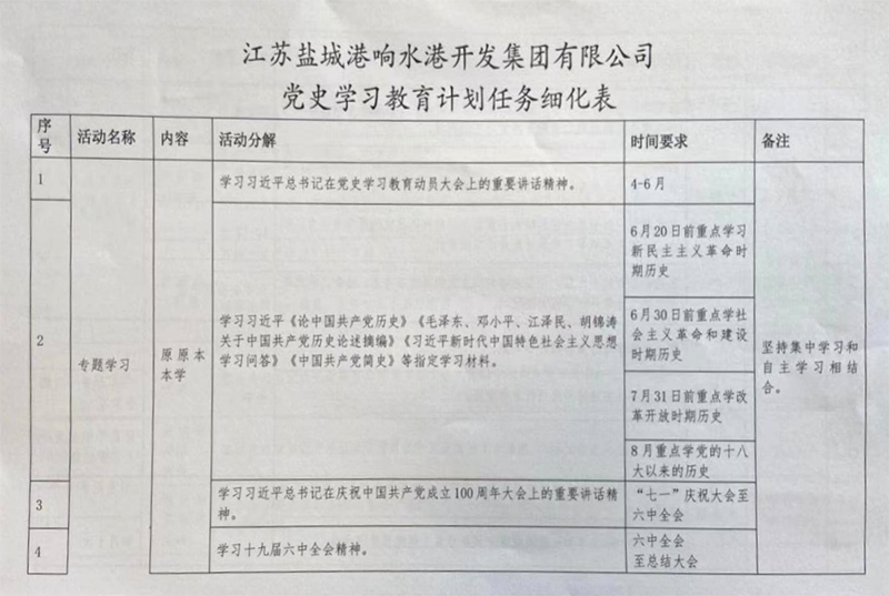 5月29日,响水港区在集中学习会上传达学习了《响水港党史学习教育计划任务细化表》,向全体党员和员工讲知了细化任务。围绕指定四本学习书籍,分期分段学习,做到有学习、有研讨、有发言、有体会,让党史学习教育往深里走、往实里走,促使党员干部进一步增强“四个意识”,坚定“四个自信”,做到“两个维护”。