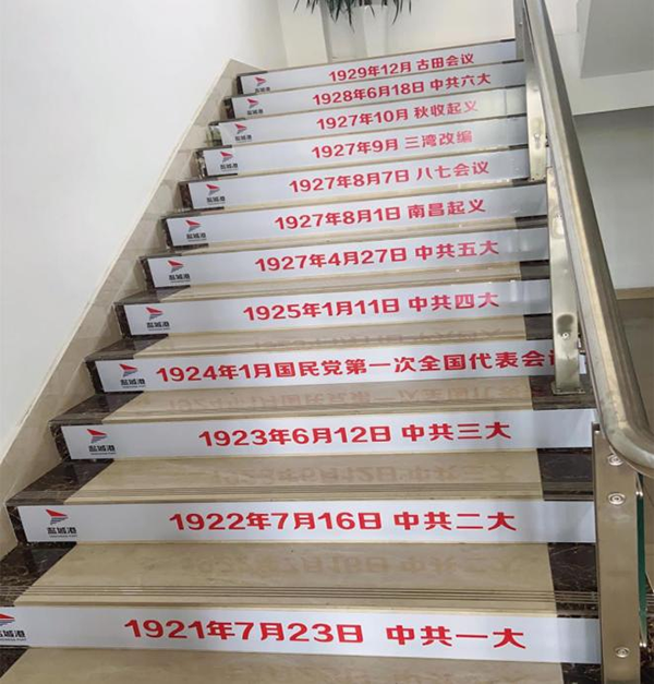针对广大干部职工工作实际,响水港区精心设计,细心研究,将学习形式和载体不断创新。近日,响水港区创新打造“楼梯课堂”,将党史发展时间历程贴印在楼梯上,方便大家在上班闲暇时,无形地将党史知识学进脑子里。“楼梯课堂”的每一个阶梯同时也代表着党的每一个发展历程,一步一台阶,扎扎实实谱新篇。响水港区员工普遍反映这个学习方式有创意有实效,巩固加深了他们对党史的掌握程度,也提高了他们学习党史的兴趣。