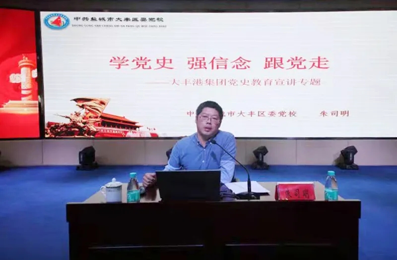 6月5日上午,大丰港区开展“学党史、强信念、跟党走”党史宣讲活动。大丰港区党委副书记、董事、总经理缪存美,大丰港区领导班子全体、港区机关全体和各子公司中层副职以上干部参加活动。