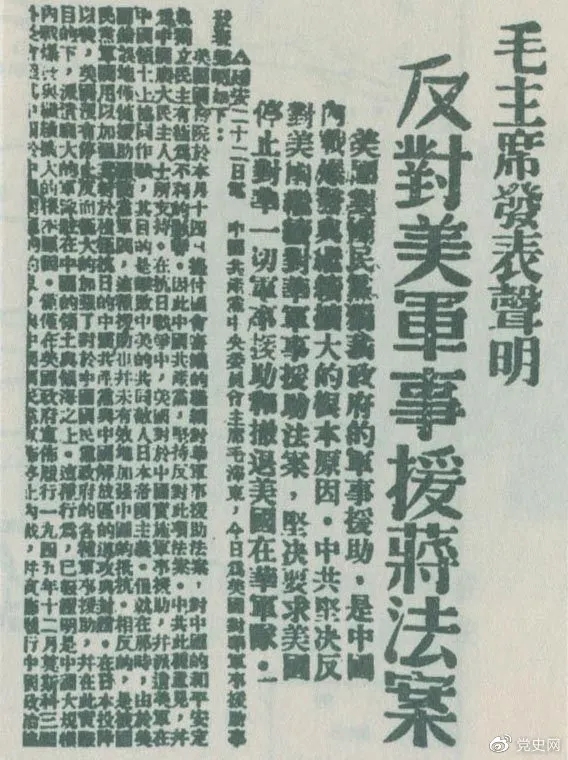 毛泽东以中共中央主席名义发表《反对美国对蒋军事援助法案的声明》。声明指出:美国国务院于本月十四日提付国会审议的继续对华军事援助法案,对中国的和平安定与独立民主有极为不利的影响,因此中国共产党坚决反对此项法案。中共此种意见,并为中国广大民主人士所支持。在抗日战争中,美国对于中国实施军事援助,并派遣美军在中国领土上协同作战,其目的是击败中美的共同敌人日本帝国主义,但就在那时,由于美国错误地仅仅援助国民党军阀,这种援助也并未有效地加强中国的抵抗,相反地是被国民党军阀用以加强其对于积极抗日的中国共产党与中国解放区的进攻与封锁。在日本投降以后,美国没有停止反而极大地加强了对于中国国民党政府的各种军事援助,并在此实际目的下派遣庞大的军队驻在中国的领土与领海之上,这种行动已经证明是中国大规模内战爆发与继续扩大的根本原因。美国实行所谓军事援助,实际上只是武装干涉中国内政,只是以强力支持国民党独裁政府继续陷中国于内战、分裂、混乱、恐怖和贫困,只是使中国不能实现整军复员和履行其对于联合国的义务,只是危害中国国家安全独立与领土主权完整,只是破坏中美两大民族的光荣友谊与中美贸易的发展前途。在此种现实情况之下,中国共产党不得不坚决反对美国政府继续以出售、交换、租借、赠送或让渡等方式将军火交给中国的国民党独裁政府,坚决反对美国派遣军事使团来华,并坚决要求美国立即停止与收回对华的一切所谓军事援助,和立即撤回在华的美国军队。