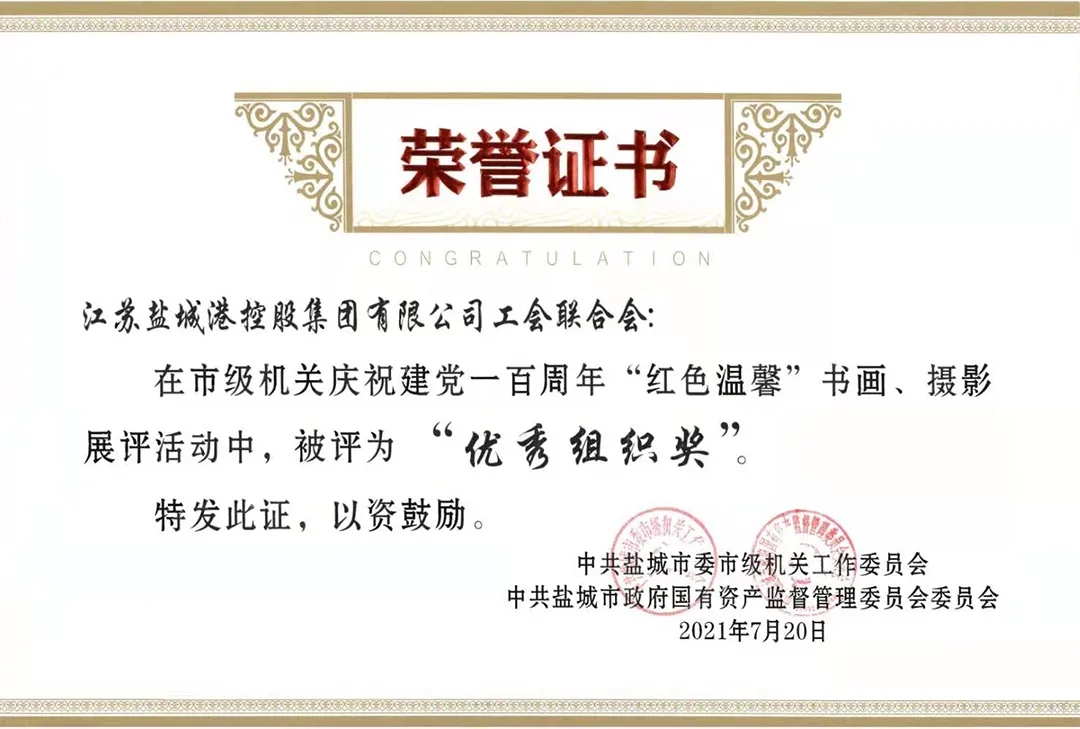 近日,中共盐城市委市级机关工作委员会与中共盐城市政府国有资产监督管理委员会委员会发布《关于市级机关庆祝建党一百周年“红色温馨”书画摄影展评活动的表扬通报》,江苏盐城港控股集团有限公司工会联合会荣获“优秀组织奖”,响水港区张宜斌同志获得“美术作品类 二等奖”。