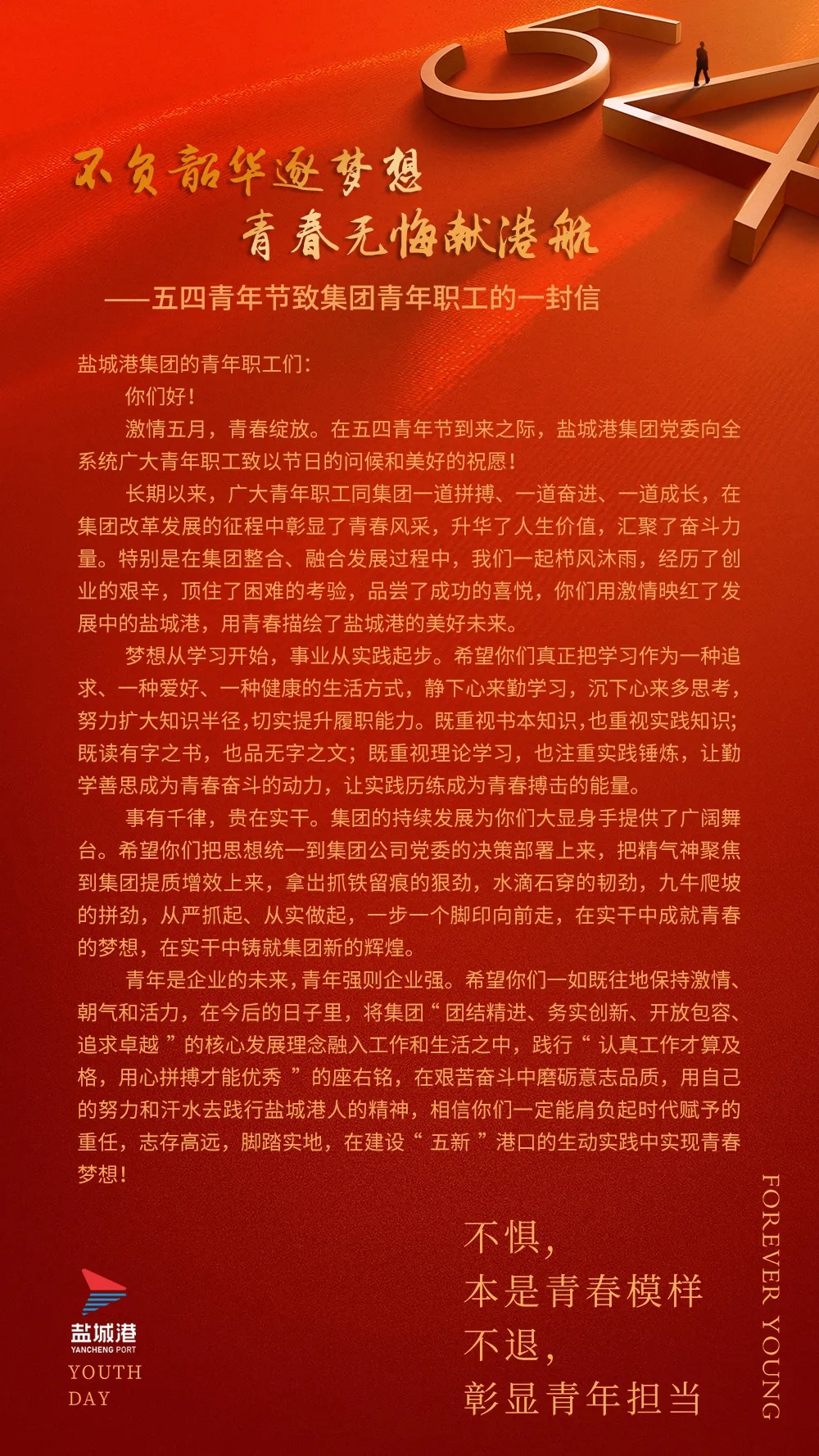 火红青春,激情五四。今年是纪念五四运动102周年,5月7日,盐城港集团组织开展“五四”青年节纪念活动,持续推进党史学习教育,汇聚青春正能量,激励广大青年干部在党史学习教育中深刻感悟五四爱国精神,赓续使命、接续奋斗,为新时代港航事业贡献青春之力。系统内各港区、各板块、盐城港引航站、机关各部门100余名青年同志参加。