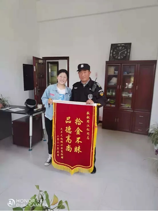 当天中午,夏女士来到物业服务中心取回手机,对物业服务处的工作人员帮其找回了手机表示感激,并提出想请周汉松吃饭以示感谢。周汉松婉言谢绝了她的好意,并称这是其应当做的,本分之内的事。几天后,夏女士带着绣有“拾金不昧·品德高尚”的锦旗来到物业客服中心前台,以表达自己对物业工作人员的谢意。
