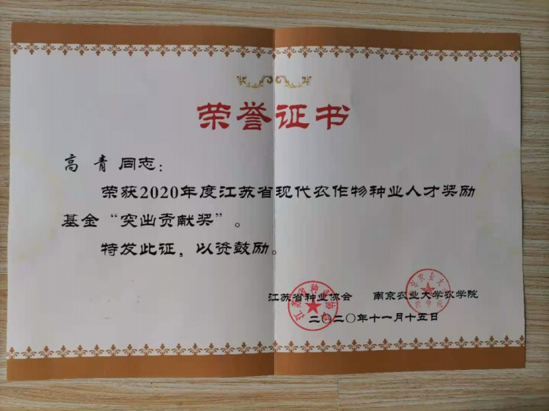 近年来,高青同志主持或参与实施省级以上科研项目7项,先后获得“江苏省现代农作物种业人才突出贡献奖”“盐城市新长征突击手”等荣誉称号。在今后,他将继续发扬育种人的“候鸟精神”,拿出“十年磨一剑”的定力和韧劲,开拓创新,积极助力盐城港集团现代农业科技发展。