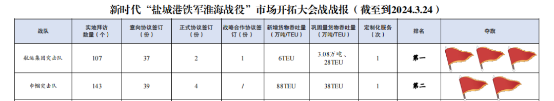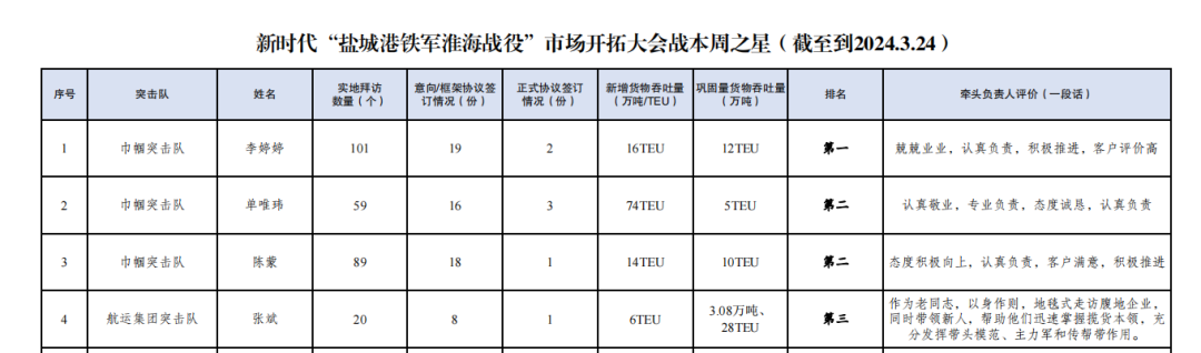 自新时代“盐城港铁军淮海战役”市场开拓大会战开展以来,航运集团积极响应盐城港集团党委号召,成立航运集团突击队和巾帼突击队,持续深化揽货拓源,大力弘扬“铁军精神”,成功实现市场开拓“新突破”,将定制化、兜底式服务推向了“新高度”。截至目前,累计拜访客户308家,签订意向协议97份,签订正式协议8份,实现新增营收超100万元,集装箱走量1008TEU。根据新时代“盐城港铁军淮海战役”指挥部第二期战报,航运集团包揽集体前两名,个人前三名,全力打响“盐城港铁军淮海战役”市场开拓大会战第一枪。