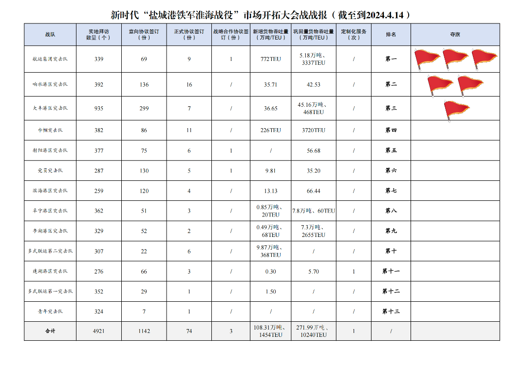 3.签订正式协议数量74份:其中响水港区突击队16份,巾帼突击队11份,航运集团突击队9份,大丰港区突击队7份,射阳港区突击队6份,多式联运第二突击队6份,党员突击队5份,滨海港区突击队4份,建湖港区突击队3份,阜宁港区突击队3份,亭湖港区突击队2份,多式联运第一突击队1份,青年突击队1份。