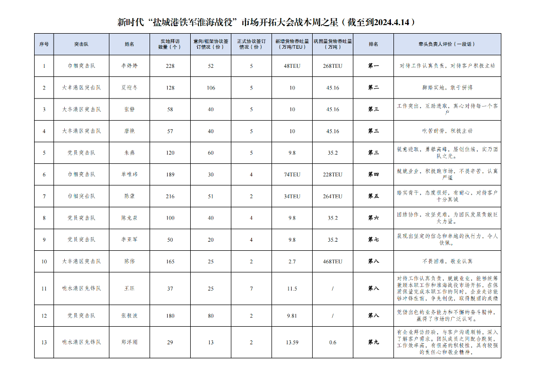 第三名:大丰港区突击队 张静(拜访客户58家,签订意向协议40份,签订正式协议5份,新增货物吞吐量10万吨,巩固量货物吞吐量45.16万吨);大丰港区突击队 唐艳(拜访客户57家,签订意向协议40份,签订正式协议5份,新增货物吞吐量10万吨,巩固量货物吞吐量45.16万吨);党员突击队 朱燕(拜访客户120家,签订意向协议60份,签订正式协议5份,新增货物吞吐量9.8万吨,巩固量货物吞吐量35.2万吨)。