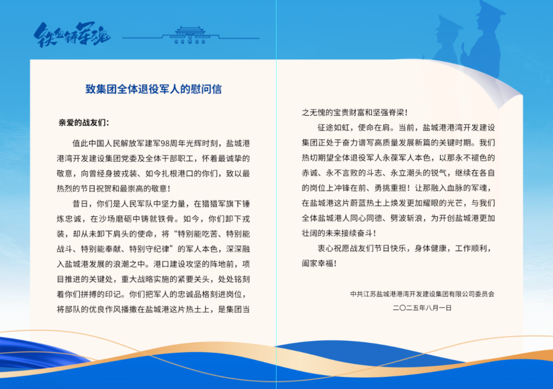 港湾集团、物流集团向奋战在各岗位的退役军人同志们送上慰问信,以笔墨传递温暖,以文字致敬荣光,凝聚着对退役军人“转业不转志、退伍不褪色”精神品格的崇高礼赞,饱含着对退役军人群体“永葆军人本色、争当行业标兵”的殷切期许。