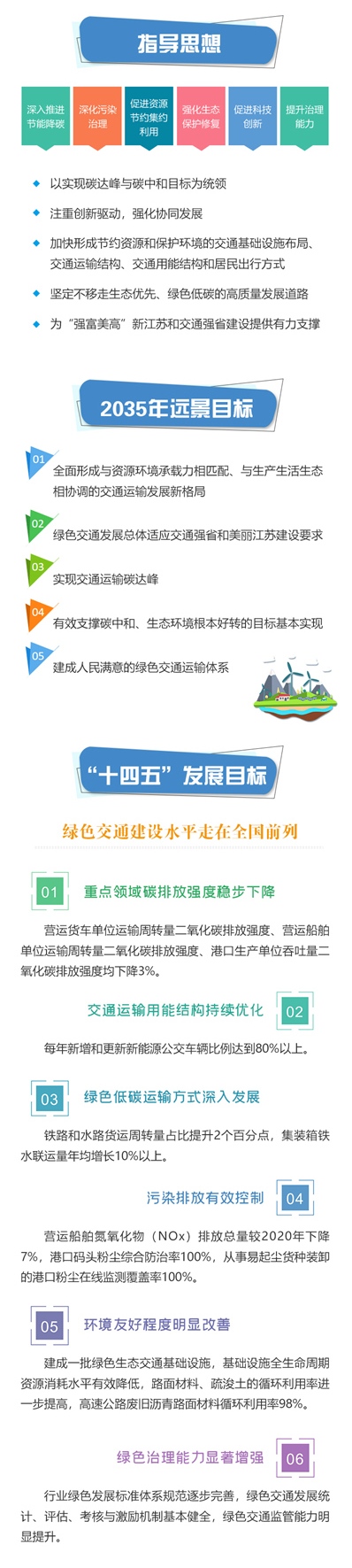 《规划》提出“到2025年,绿色交通建设水平走在全国前列”的总体目标,坚持走“生态优先、绿色低碳”高质量发展的新路,明确“低碳化、清洁化、生态化、长效化”4条发展主线:推动行业低碳化发展方面,重点解决运输装备清洁化发展、公路货运和社会车辆的碳减排问题,支撑碳达峰目标的实现;推动行业清洁化发展方面,以港口、船舶、营运车辆和公路建设为重点,开展交通运输行业污染深度治理,促进减污降碳协同效应的发挥;推动行业生态化发展方面,在健全完善绿色交通基础设施地方标准体系的基础上,布局实施一批省级绿色交通基础设施建设工程,全面提升交通基础设施的环境友好程度;推动行业长效化发展方面,全面建立以绿色发展为导向的制度标准体系、科技创新体系和监督管理体系,提升绿色交通治理能力和水平。