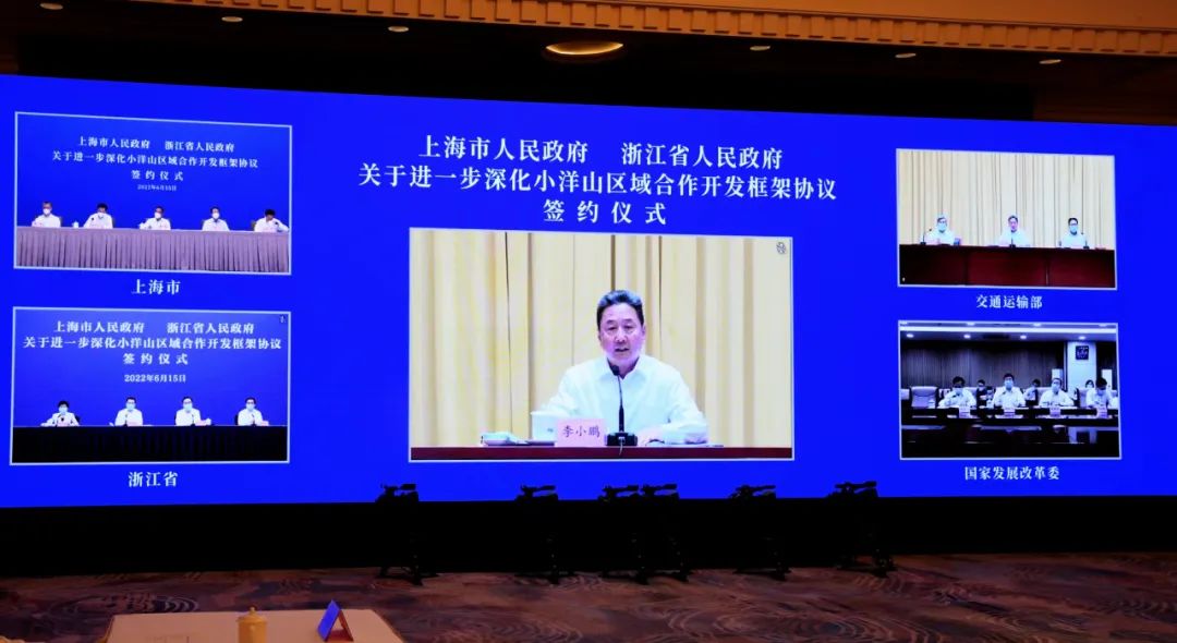 6月15日下午,上海市政府与浙江省政府以视频连线方式正式签署进一步深化小洋山区域合作开发框架协议。上海市委书记李强、浙江省委书记袁家军和交通运输部部长李小鹏、国家发展改革委副主任胡祖才出席签约活动并讲话。上海市委副书记、市长龚正,浙江省委副书记、省长王浩共同签署协议。