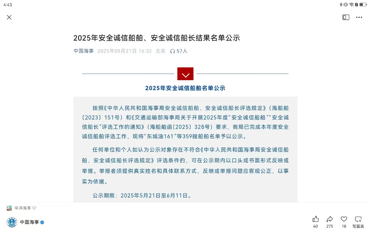 “安全诚信船舶”是国内航运业的最高荣誉,由地市级、省级海事管理机构层层筛选,从申请主体的近三至五年的安全检查、事故险情、违章处罚等各项表现进行全面“过筛”,最终由交通运输部海事局组成专门的评选委员会进行审查认定并向社会公布。获评该荣誉的船舶可以享受延长24个月检查窗口期等一系列便利化措施。