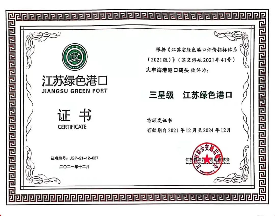 12月18日,2021年度江苏省星级绿色港口授牌仪式在南京举行,由盐城港大丰港区港口公司申报的大丰海港港口码头获得“三星级绿色港口”殊荣。
