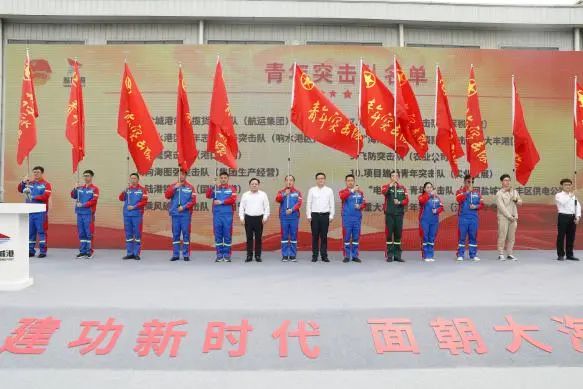 活动中,与会领导为12个围绕服务重大项目而组成的青年集体突击队进行授旗,青年突击队、青年文明号代表作表态发言,并举行了“强国复兴有我 青春燃在海港”盐城港青年宣誓仪式。