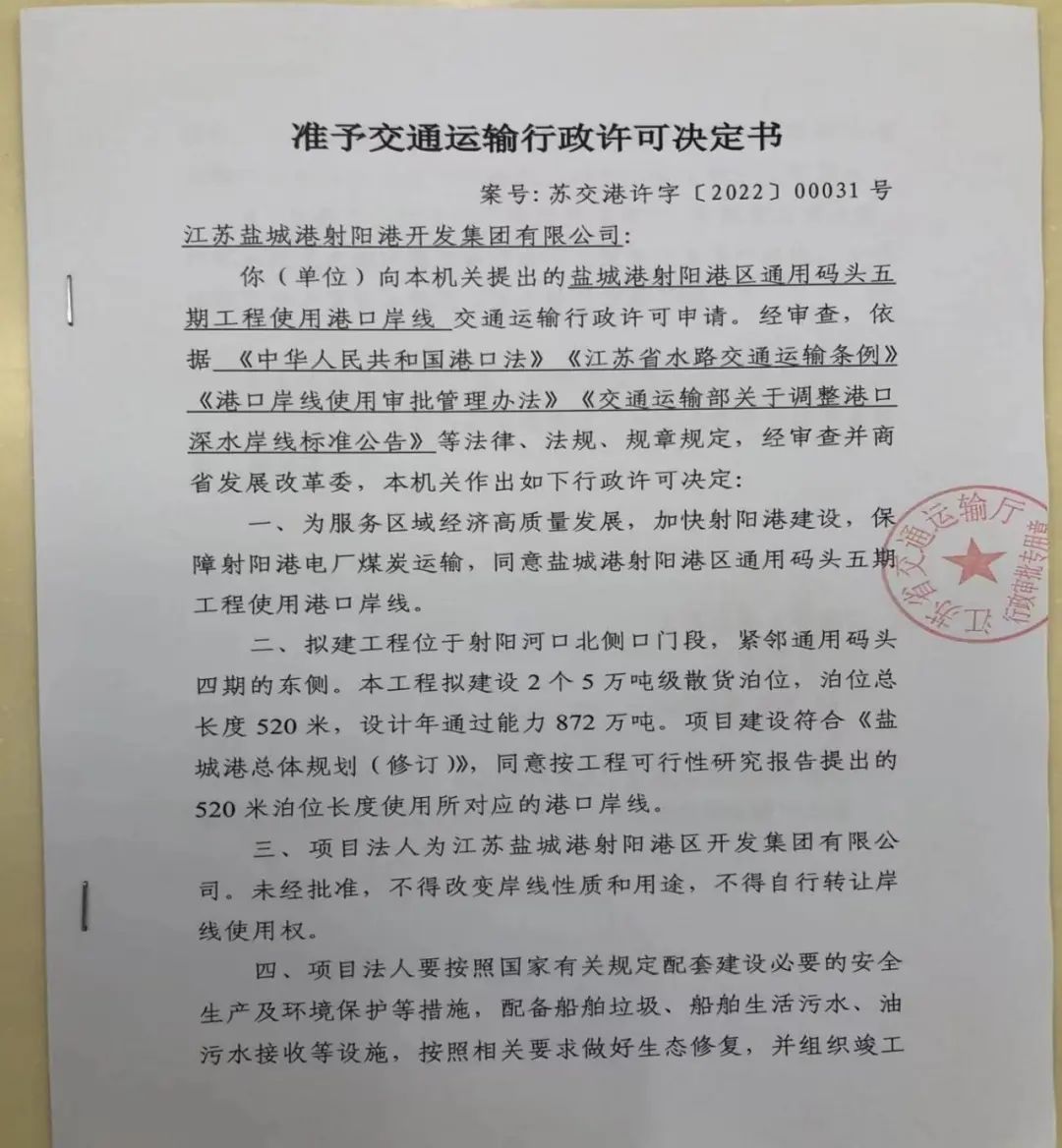 9月16日,盐城港射阳港区通用码头五期工程岸线取得江苏省交通运输厅正式批复。截至目前,该项目前期工可报告、稳评、通航安全技术报告、防洪评价、岸线全部通过批复,这标志着项目开工正式迈入“快车道”。