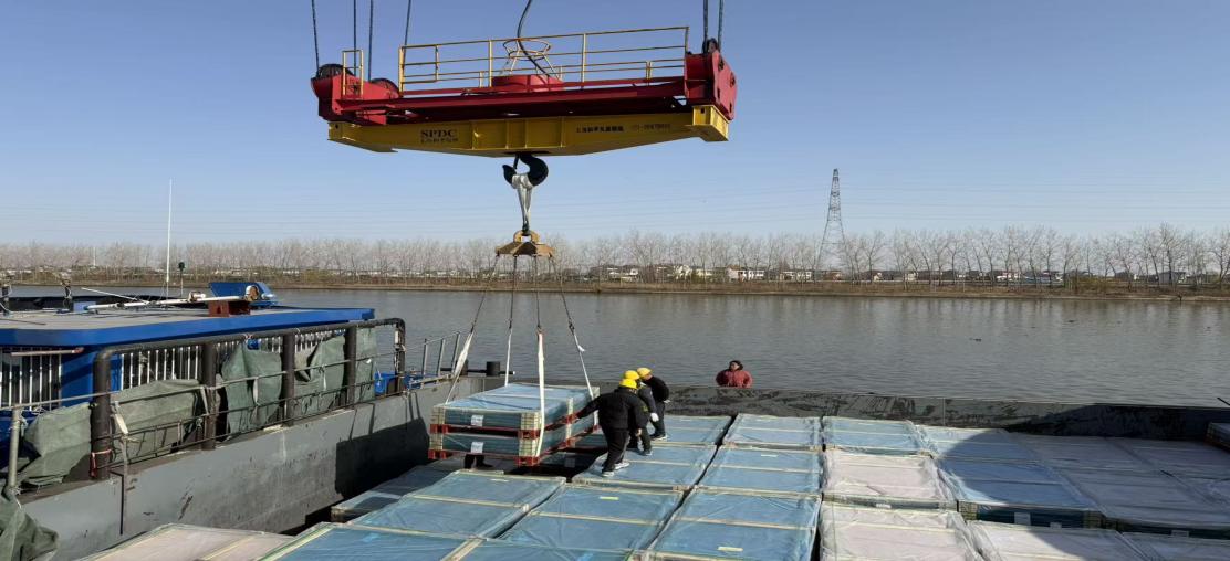 光伏组件因其单板尺寸超规、重量集中且表面玻璃极易受损的特点,对装卸精度和防护措施提出了“毫米级”要求,这也是行业内大型光伏设备运输的共性难题。为应对这一挑战,亭湖港提前部署专项攻坚方案,组织骨干开展吊钩专项操控培训,重点强化重心平衡控制与防损操作规范;创新优化装卸流程设计,模拟船舶甲板至陆域转运全场景,通过反复推演打磨吊装轨迹,彻底消除作业盲区,成功实现组件“零损伤”装卸。