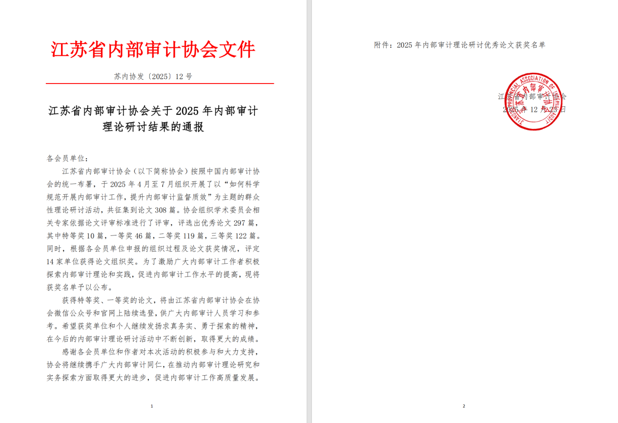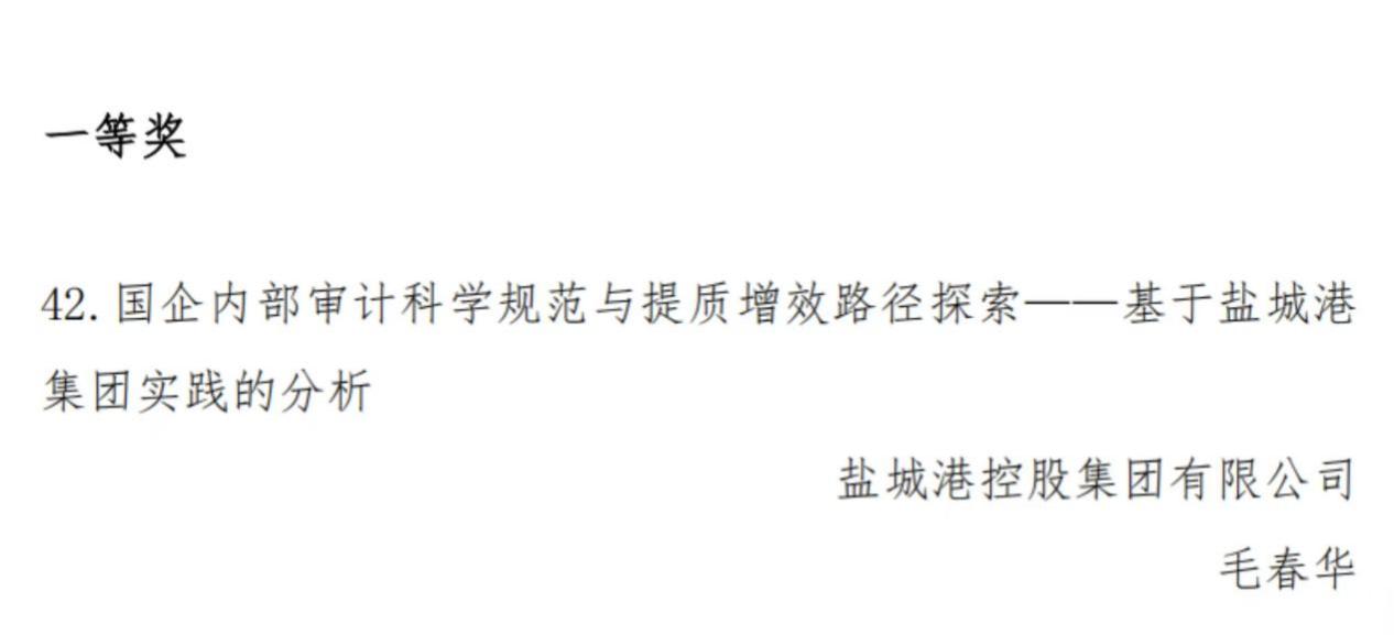 12月24日,江苏省内部审计协会公布了2025年度省内部审计理论研讨活动获奖结果,集团审计部报送的《国企内部审计科学规范与提质增效路径探索——基于盐城港集团实践的分析》论文荣获一等奖。