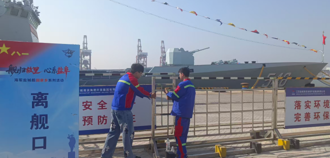 借鉴专业港口保障经验,结合滨海港现有条件与现状,靠前谋划,打通信息对接、要素联动、应急响应快捷赛道,以最高标准、最严要求做好“盐城舰”靠泊全周期衔接,让家乡舰泊得安心、靠得稳妥;成立专项服务保障小组,健全专项保障指挥体系,明确分工、压实责任,形成“统筹协调、精准对接、全程跟进”工作机制;细化靠泊、安保、补给全流程方案,依托网格化管理与智能调度为核心载体,24小时实时监控2#码头动态,确保服务环节无缝衔接、高效协同、安全有序运转。
