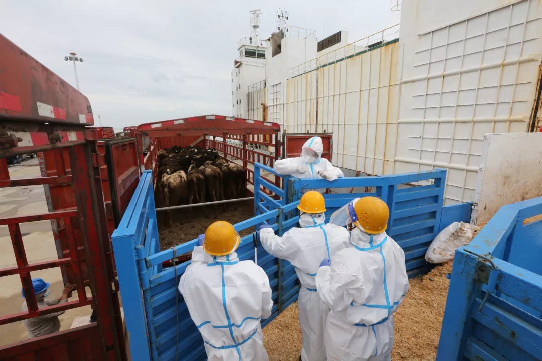 早在船舶抵港前一周,盐城港船舶代理公司便联系各方召开了船前会,部署安排各项准备工作,及时向船方通报相关要求,同时密切关注航行动态以及活牛健康状况。到港前,正值强对流天气多发季节,码头人员密切关注天气状况,天气一经转好便联系引水拖轮,抢抓窗口期安排船舶进港,同时提前安排转运车辆消杀进港,船舶靠港后,码头工作人员认真组织防疫、消杀工作,在最短时间内完成联检工作,为活牛卸船争取了时间。