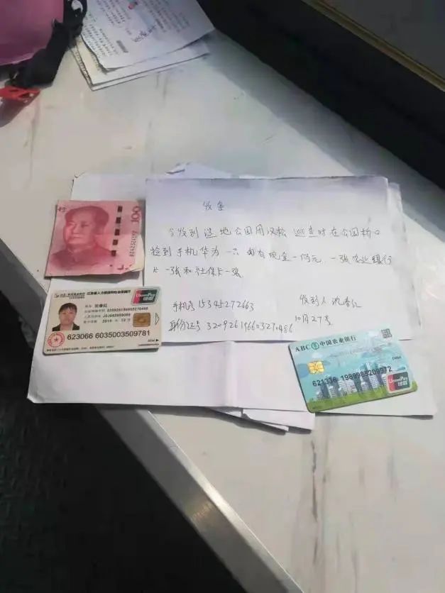 11月9日,盐城港物业保安周汉松和往常一样在所属项目东郊公园内巡逻执勤,巡逻中发现马路上“躺”着一部手机,经检查手机外观未损坏能亮屏,手机背面还有银行卡、社保卡及少量现金。周汉松第一时间将现场情况进行上报,并时刻注意着手机来电。很快便接到了外来电话,来电人自称是失主,周汉松在电话里告知对方方位,请对方到达现场进一步确认。