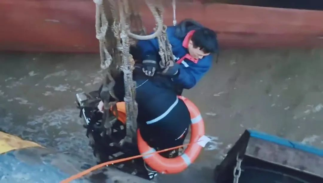 套好救生圈,拉紧救生绳,再配合船上吊机,一拖一拽之间成功将落水船员救上岸,整个救援过程仅仅用了5分钟。据了解,落水船员目前生命体征正常,精神状态良好。