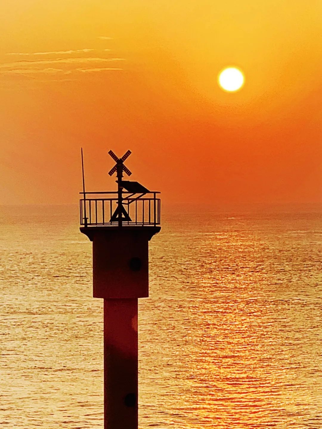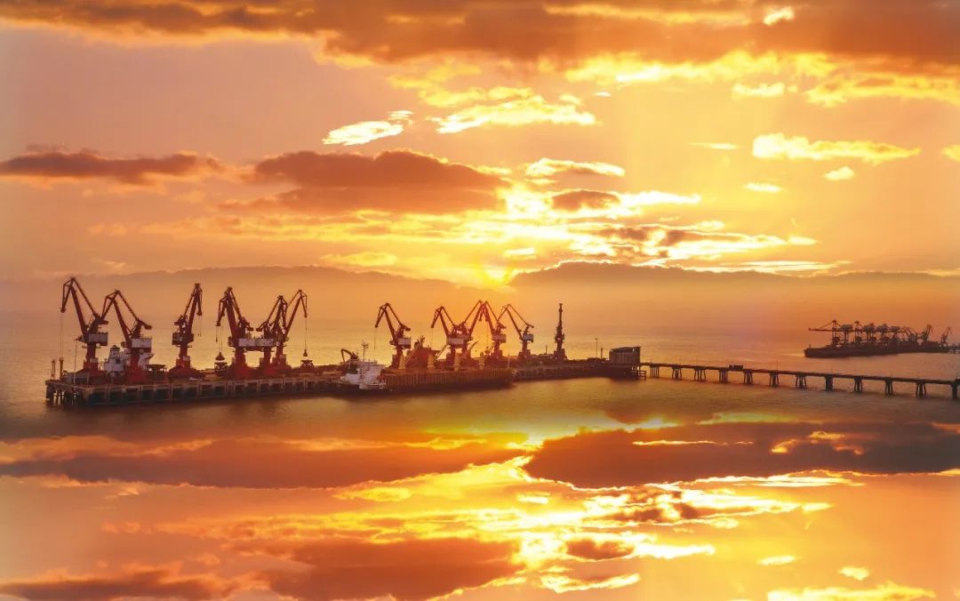 海平面上,太阳冉冉升起,映红了海面和天空,照耀着海港的迷人和神奇,新兴和璀璨。