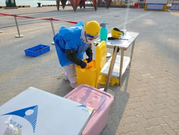 本次演练从实战出发,结合港口实际,检验港口一线防疫工作人员对核酸检测呈阳性人员的发现、隔离、疫情报告、转运、个人防护及消杀等能力。