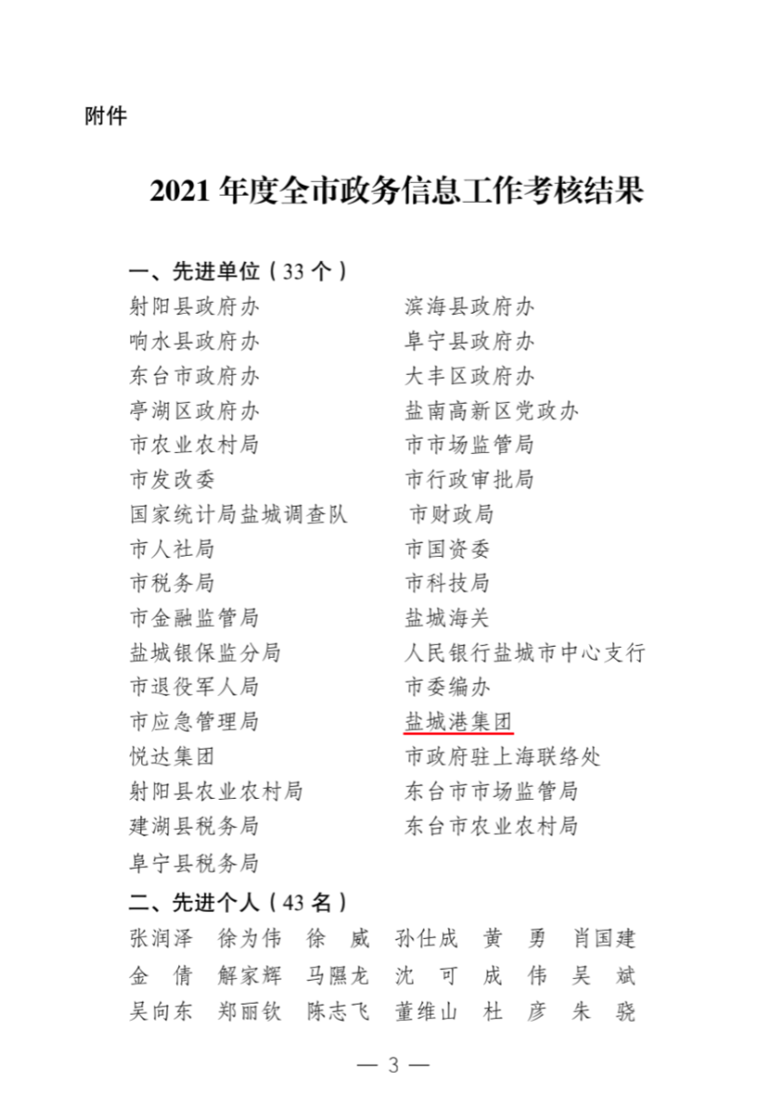 3月8日,市政府办公室公布2021年度全市政务信息工作考核结果,集团获评“2021年全市政务信息工作先进单位”,位列市直报点单位前列。同时,我集团参与报送的《江苏反映:主要航线国际运价明显上涨不合理收费抬高运价》荣获优秀政务信息一等奖。集团新闻条线一名同志获“2021年全市政务信息工作先进个人”称号。