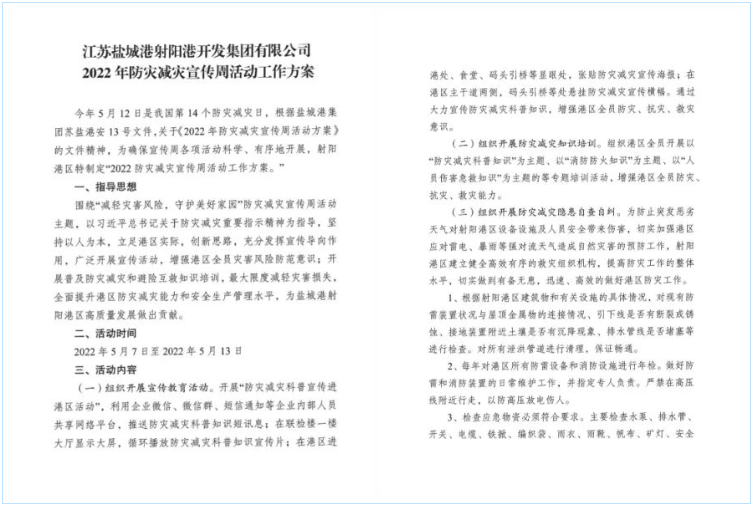 今年5月12日是我国第14个防灾减灾日,根据盐城港集团苏盐港安13号文件,关于《2022年防灾减灾宣传周活动方案》的文件精神,围绕“减轻灾害风险,守护美好家园”防灾减灾宣传周活动主题,以习近平总书记关于防灾减灾重要指示精神为指导,坚持以人为本,立足港区实际,广泛开展宣传周各项活动,增强港区全员灾害风险防范意识,全面提升港区防灾减灾抗灾能力和安全生产管理水平。