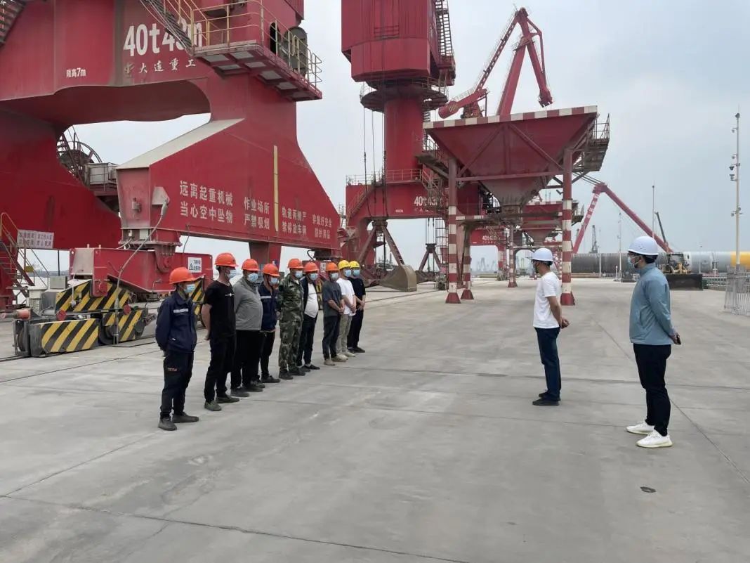 重件码头分公司组织开展门机作业故障排除应急演练。演练模拟门机作业在熟料入库时,在入料斗时发现提升机处冒出大量黑色浮尘的场景。门机司机发现险情,报告于现场调度,一系列的故障排除措施有序开展,维修人员查找故障为较多大块凝固体在提升机中导致无法作业,随即清理障碍,重新启动机器。此次应急演练,充分展现了作业人员在码头大型装卸设备作业的安全应急能力以及后续影响处理能力。