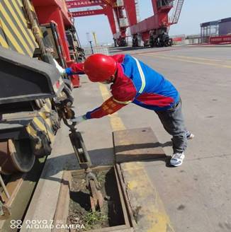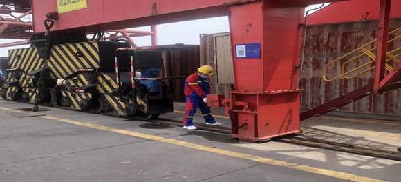 随着一声指令的下达,演练正式开始,粮食码头1#泊位“腾海明宇”轮作业过程中突然接上级通知,码头1小时后将突发强对流天气,伴有雷电、大风、暴雨等紧急情况。现场调度立即启动突发极端天气机械设备防风锚定应急预案,门机停止作业、抓斗降至码头面、更换钩头、放下行走锚定,保障人员拉起门机防风拉索、安全巡查员对各处防风锚定情况进行再检查、作业车辆就地停车并开启双闪、设备维护组人员全部保持待命抢修状态。在场人员分工明确、各司其职、井然有序,仅用10分钟,所有机械锚定任务全部完成,所有作业人员撤离到安全区域进行复盘点评,演练圆满结束。
