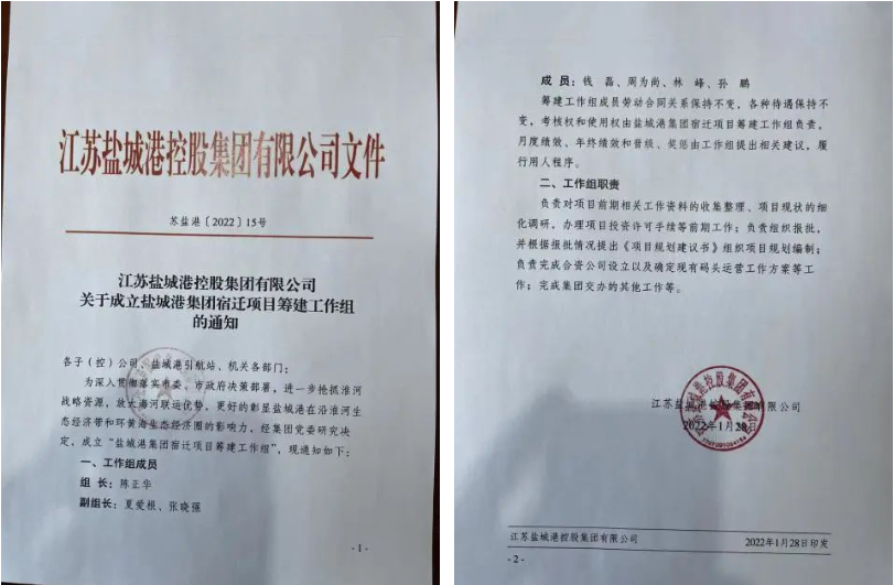 1月28日,盐城港集团党委研究成立了宿迁项目筹建工作组;