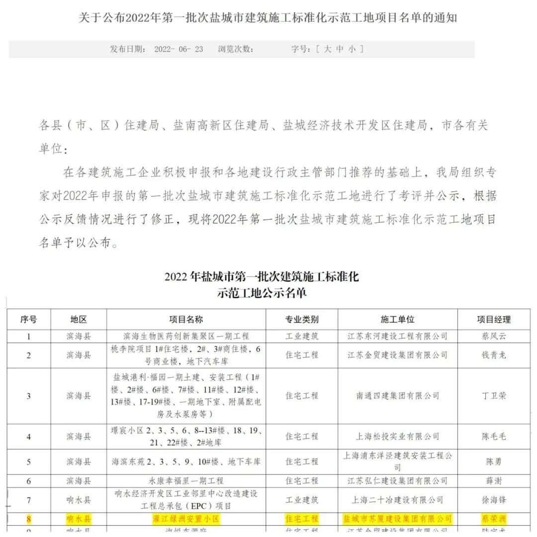 日前,江苏省盐城市住房和城乡建设局公布2022年第一批次盐城市建筑施工标准化示范工地项目名单,由项目管理公司代管的响水县灌江绿洲安置小区项目荣获“盐城市建筑施工标准化示范工地”称号。