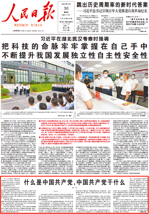 6月30日,人民日报头版刊发“宣言”署名文章《什么是中国共产党,中国共产党干什么》。文章指出,了解中国,必须了解中国共产党;了解中国共产党,才能读懂中国。历史已经证明并将继续证明,中国共产党是用马克思主义武装起来的觉悟者,是最广大人民利益的守护者,是人类社会发展方向的引领者,是最光明最正义最壮丽事业的奋斗者。