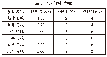 堆场仿真参数:2.1 堆场布局参数港口装卸作业区布置2个10万吨级泊位,每个泊位配备3台岸桥,总计6台岸桥,编号分别为Crane 1、Crane 2、Crane 3、Crane 4、Crane 5、Crane 6。港口堆场作业区规划有4个箱区,编号分别为E01、E02、E03、E04。在堆场布置方面,E01箱区为近海侧箱区,E04箱区为近陆侧箱区,E01、E02箱区为出口箱区,E03、E04箱区为进口箱区。在港口堆场作业区规划中,将E01箱区设置为9列5层箱区,E02、E03、E04箱区设置为12排5层箱区,每个箱区配备有2台场桥协同作业,总计8台场桥,编号分别为A01、A02、A03、A04、A05、A06、A07、A08。2.2 堆场设备参数港口堆场作业设备主要包括场桥、岸桥、集卡等,上述设备的运行参数即为堆场仿真系统的输入参数。根据实际集装箱堆场作业数据,对作业设备进行参数设置。岸桥运行参数见表1,集卡运行参数见表2,场桥运行参数见表3。