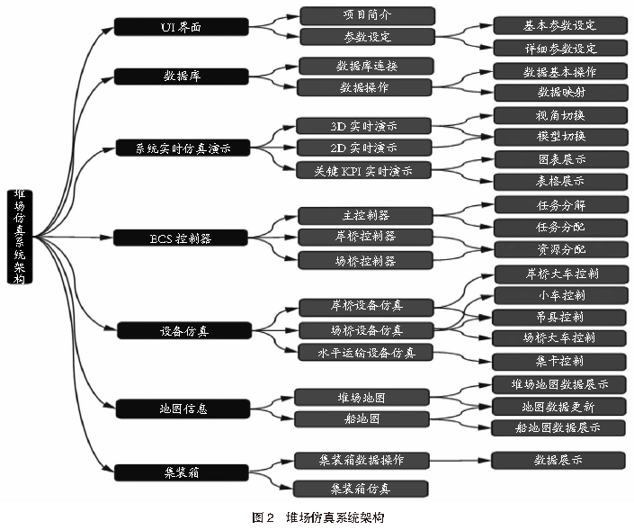 3仿真模型搭建3.1 堆场仿真系统架构根据港口堆场作业特点和堆场系统功能,设计搭建港口堆场仿真系统架构。该架构主要包括UI界面、数据库、系统实时仿真演示、ECS控制器、设备仿真、地图信息、集装箱等部分,主要用于实现数据交互、模型设计、任务调度管理、仿真测试、结果演示等功能。堆场仿真系统架构见图2。