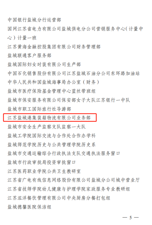 近日,市总工会发布《关于表扬盐城市女职工先进集体和先进个人的决定》,袁欣同志、江苏盐城港集装箱物流有限公司业务部,分别获得“盐城市五一巾帼标兵”“盐城市五一巾帼标兵岗”荣誉称号。