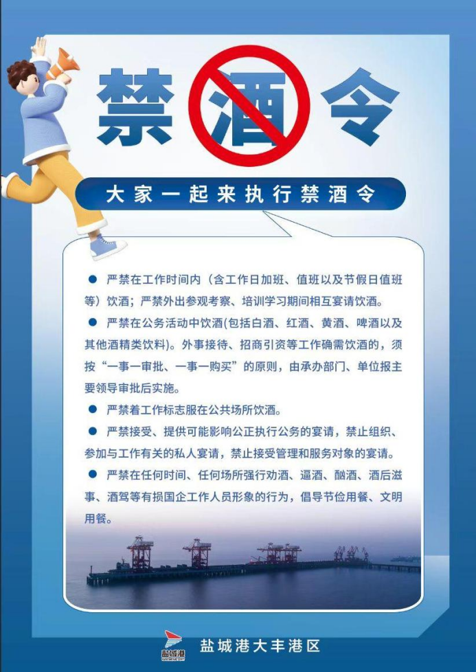 为贯彻全面从严治党要求,加强工作纪律,营造风清气正的良好环境,盐城港大丰港区颁布最新禁酒令,要求大丰港区全体干部职工在工作时间、公务活动等情况下,一律禁止饮酒,以维护盐城港集团员工的良好形象。