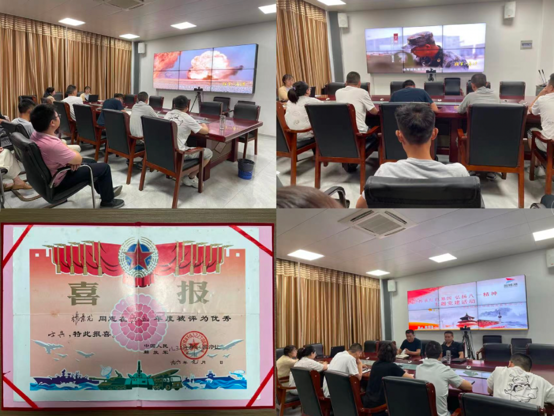 庆八一,悟精神。党支部全体党员集中观看了习近平总书记强军思想系列微视频,并向两位退伍老党员致以节日的问候和祝福,激励党员干部要不断加强理论武装,坚定信念,担当作为、锐意进取;随后,与会人员还集中观看了红色影片《建军大业》,通过感人至深的红色故事,进一步引导全体党员悟初心使命,汲取前进动力,坚定不移跟党走。